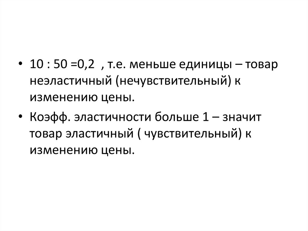 • 10 : 50 =0,2 , т.е. меньше единицы – товарнеэластичный (нечувствительный) к