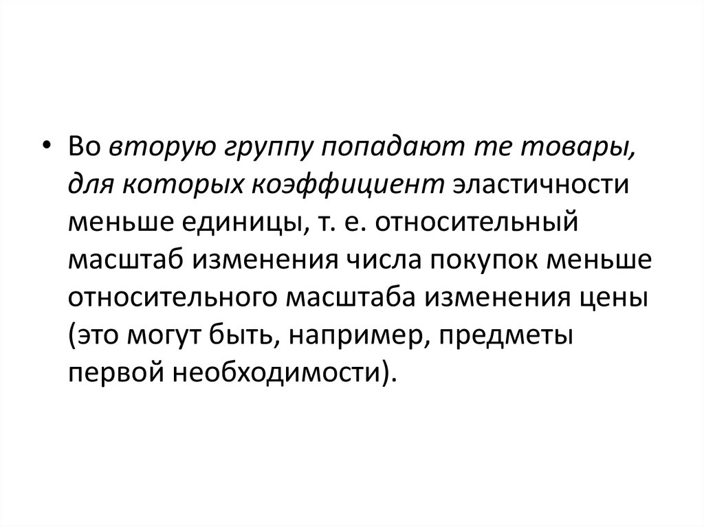 • Во вторую группу попадают те товары,для которых коэффициент эластичности