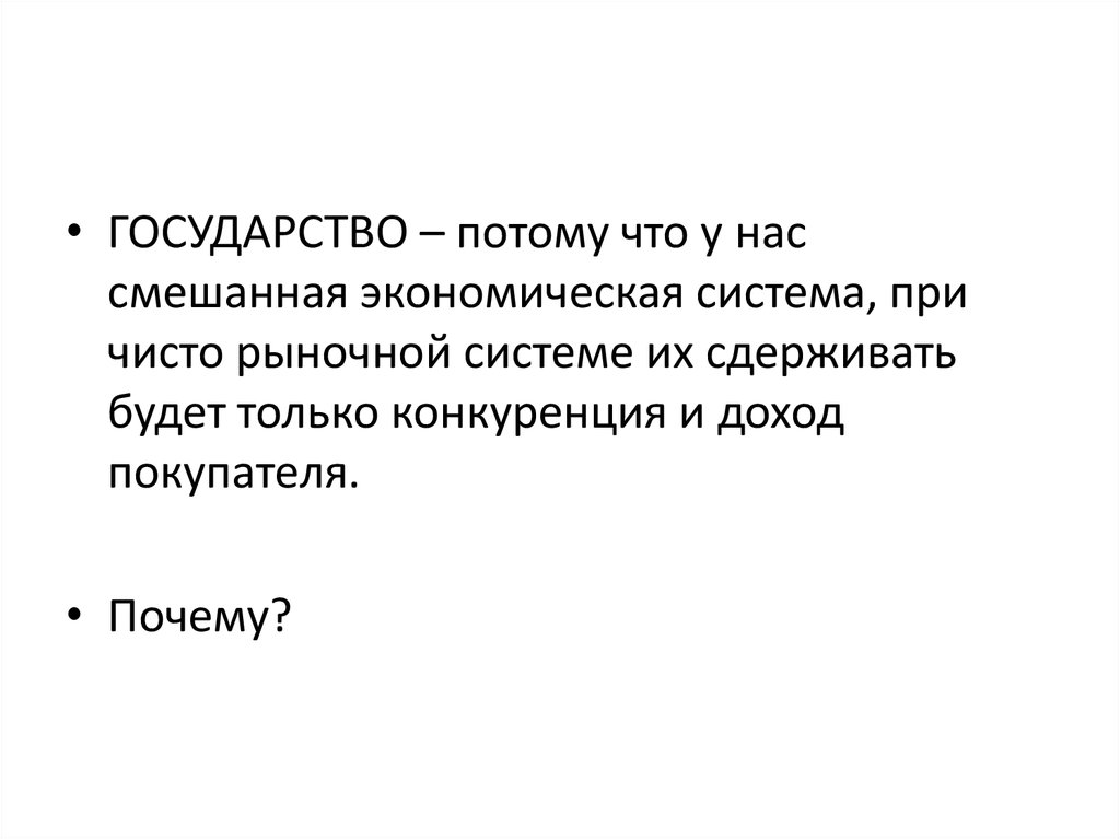 • ГОСУДАРСТВО – потому что у нассмешанная экономическая система, при
