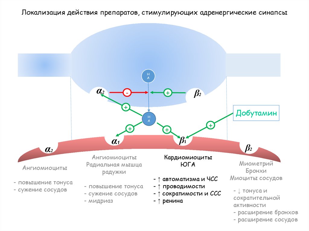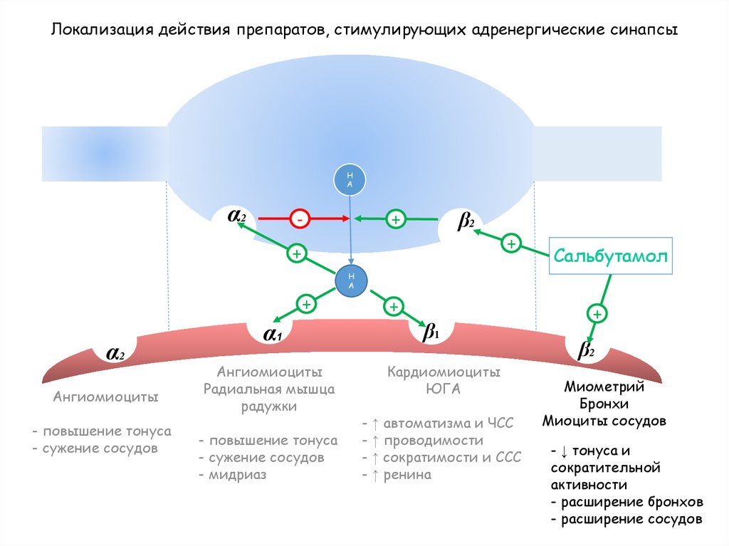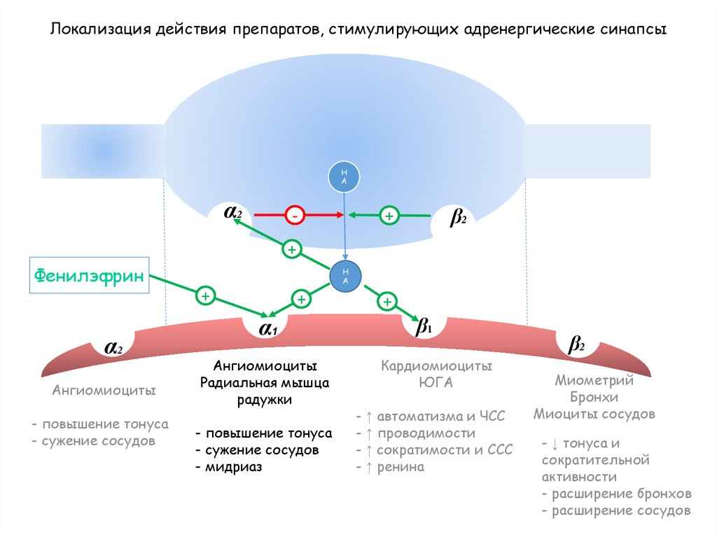 Локализация действия препаратов, стимулирующих адренергические синапсыН