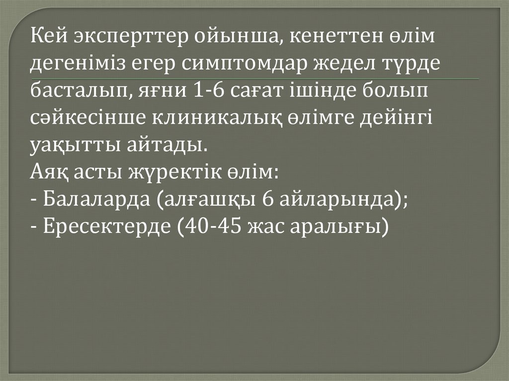 Кей эксперттер ойынша, кенеттен өлімдегеніміз егер симптомдар жедел түрде