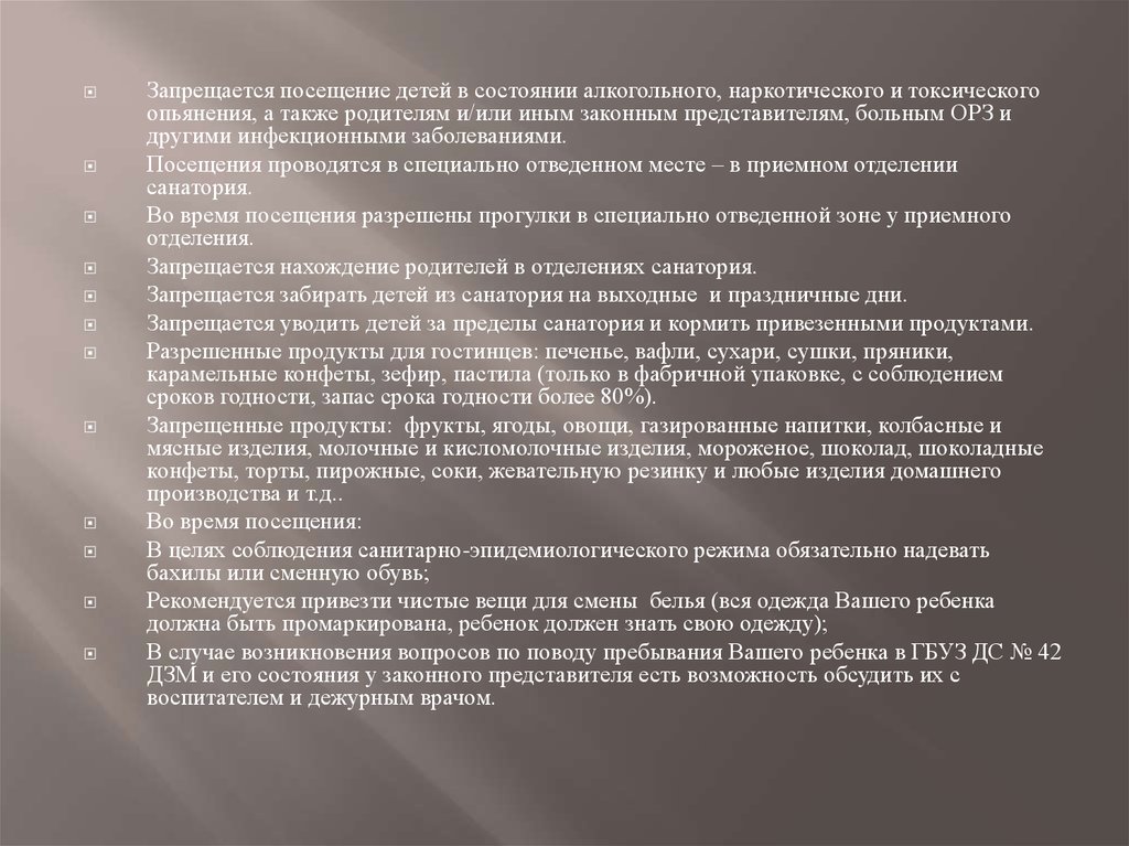 Не рекомендуются посещения детей в адаптационный период (первые 7 дней).Посещения проводятся по предварительной записи у секретаря санатория, в строго