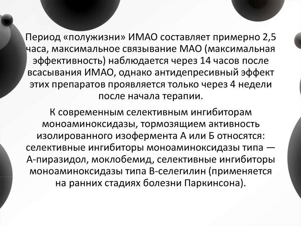 Период «полужизни» ИМАО составляет примерно 2,5часа, максимальное связывание МАО (максимальная