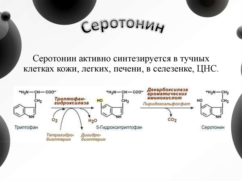 Серотонин активно синтезируется в тучныхклетках кожи, легких, печени, в селезенке, ЦНС.