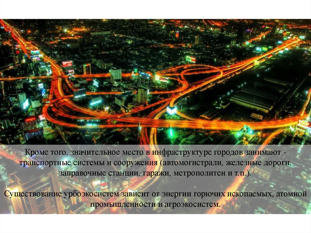 Кроме того, значительное место в инфраструктуре городов занимают транспортные системы и сооружения (автомогистрали, железные дороги,заправочные станции, гаражи, метрополитен и т.п.).