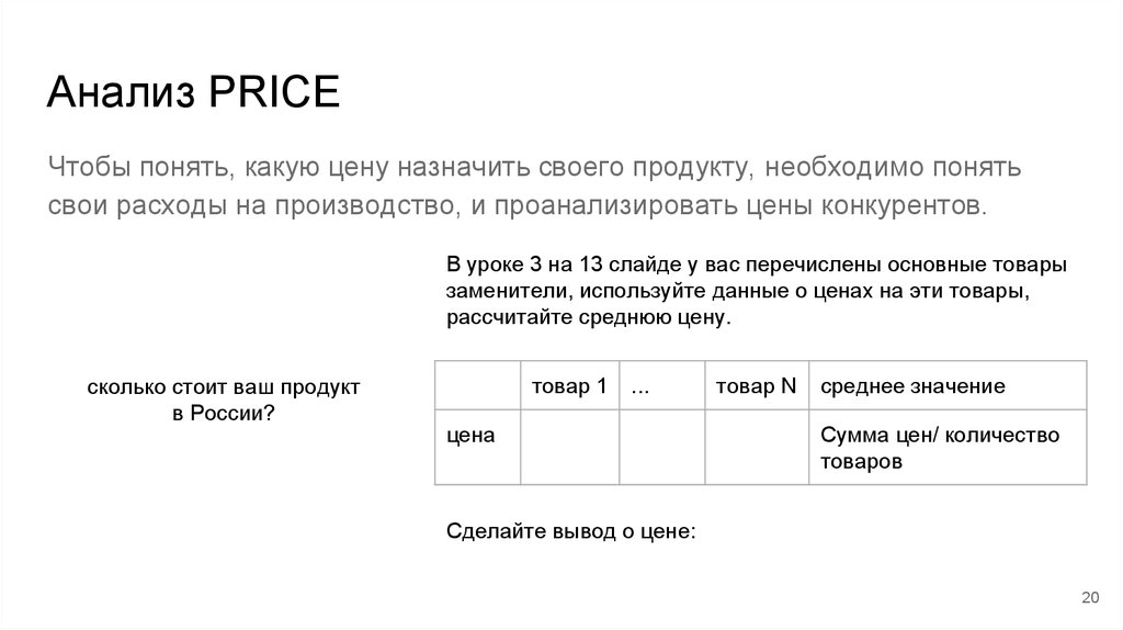 Анализ PRICEЧтобы понять, какую цену назначить своего продукту, необходимо понять