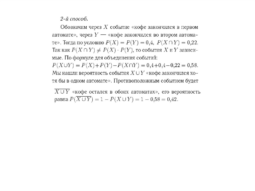 Задача 8. В торговом центре два одинаковых автомата продают кофе. Вероятностьтого, что к концу дня в автомате закончится кофе, равна 0,4. Вероятность того, что