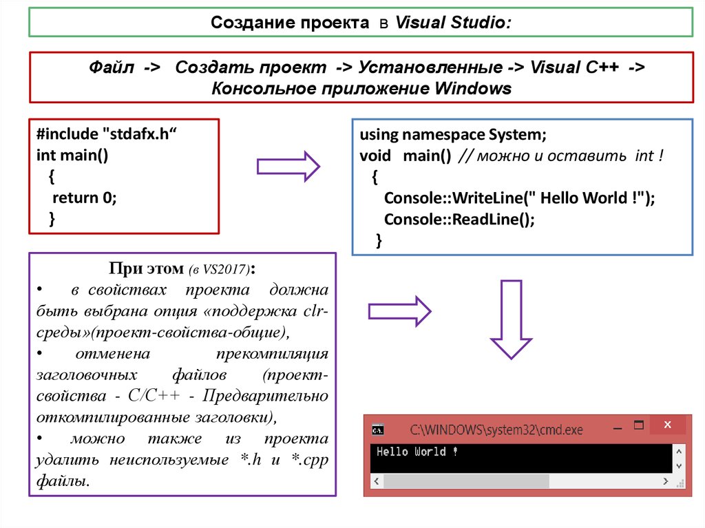Cоздание проекта в Visual Studio:Файл -> Создать проект -> Установленные -> Visual C++ ->