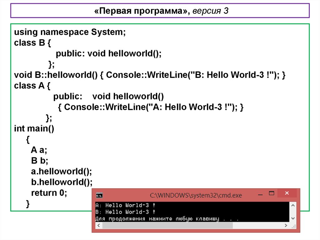 void B::helloworld() { Console::WriteLine("B: Hello World-3 !"); }