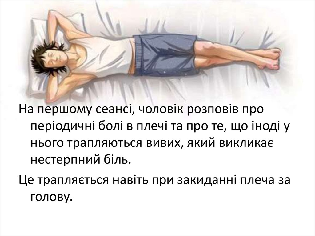 На першому сеансі, чоловік розповів проперіодичні болі в плечі та про те, що іноді у