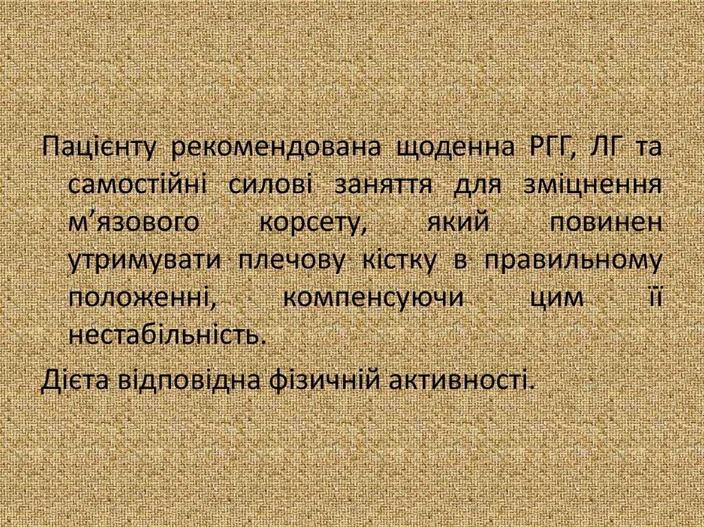 Пацієнту рекомендована щоденна РГГ, ЛГ тасамостійні силові заняття для зміцнення