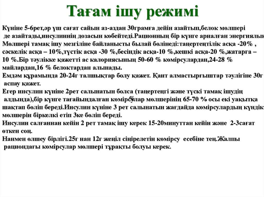 де азайтады,инсулиннің дозасын көбейтеді.Рационның бір күнге арналған энергиялық