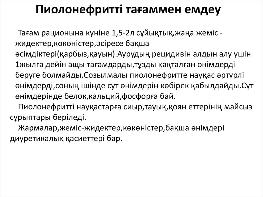 Пиолонефритті тағаммен емдеуТағам рационына куніне 1,5-2л сұйықтық,жаңа жеміс жидектер,көкөністер,әсіресе бақша