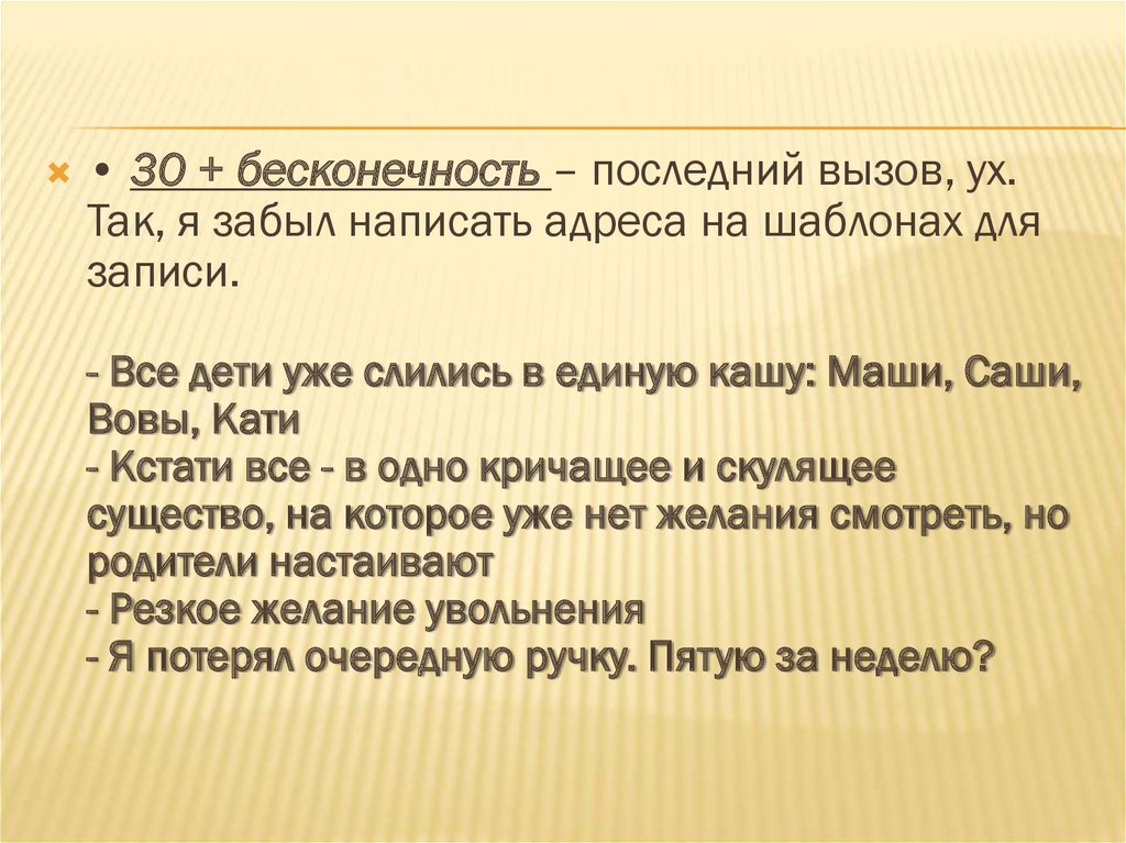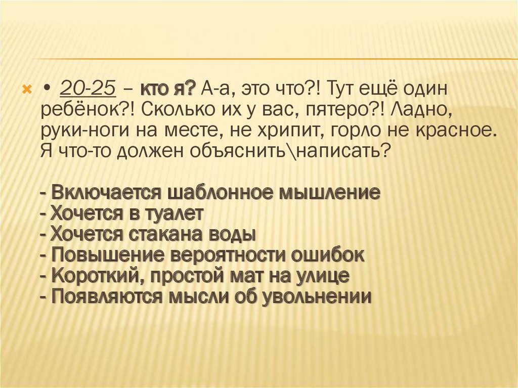 • 20-25 – кто я? А-а, это что?! Тут ещё одинребёнок?! Сколько их у вас, пятеро?! Ладно,