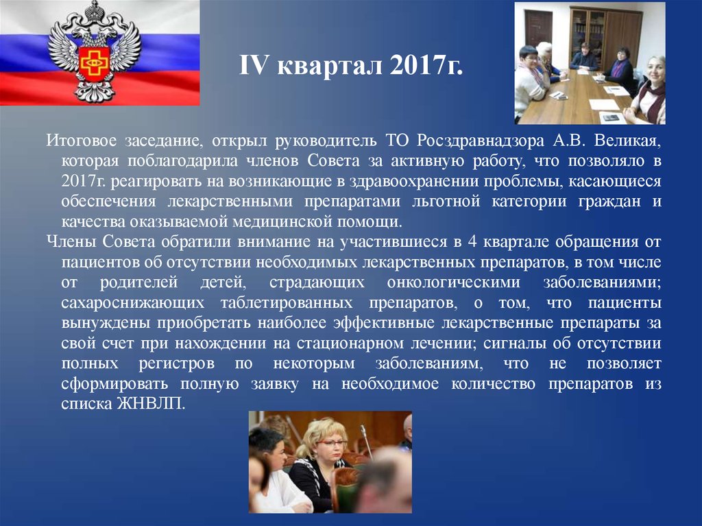 IV квартал 2017г.Итоговое заседание, открыл руководитель ТО Росздравнадзора А.В. Великая,