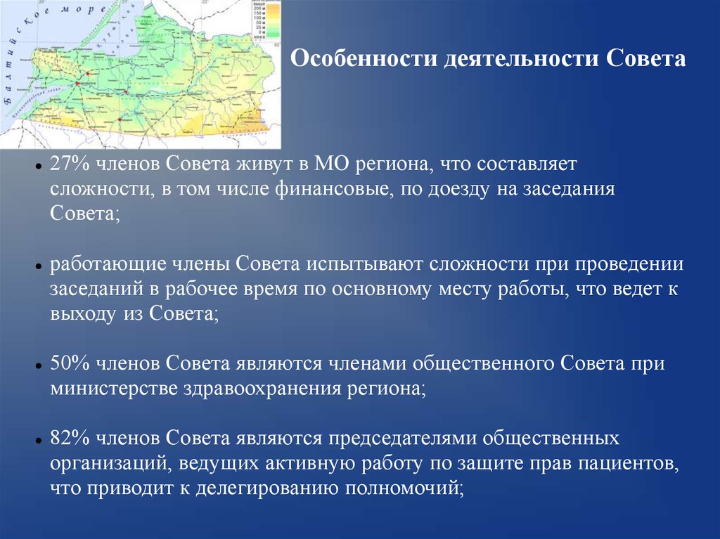 Особенности деятельности Совета27% членов Совета живут в МО региона, что составляет