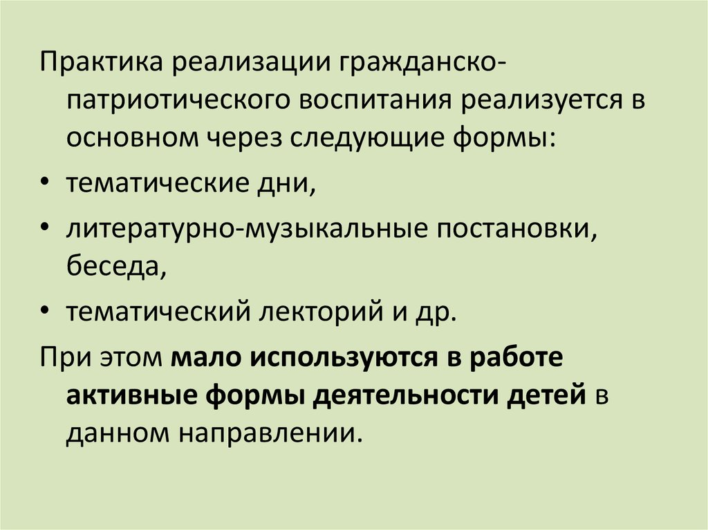 Практика реализации гражданскопатриотического воспитания реализуется восновном через следующие формы: