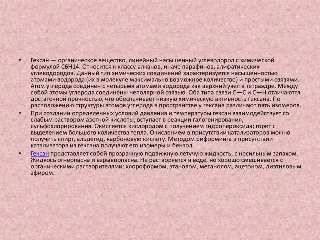 Гексан — органическое вещество, линейный насыщенный углеводород с химической