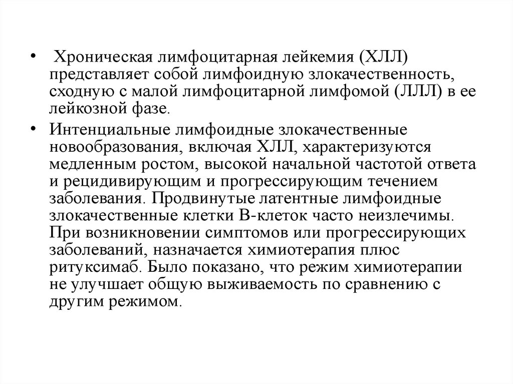 • Хроническая лимфоцитарная лейкемия (ХЛЛ)представляет собой лимфоидную злокачественность,