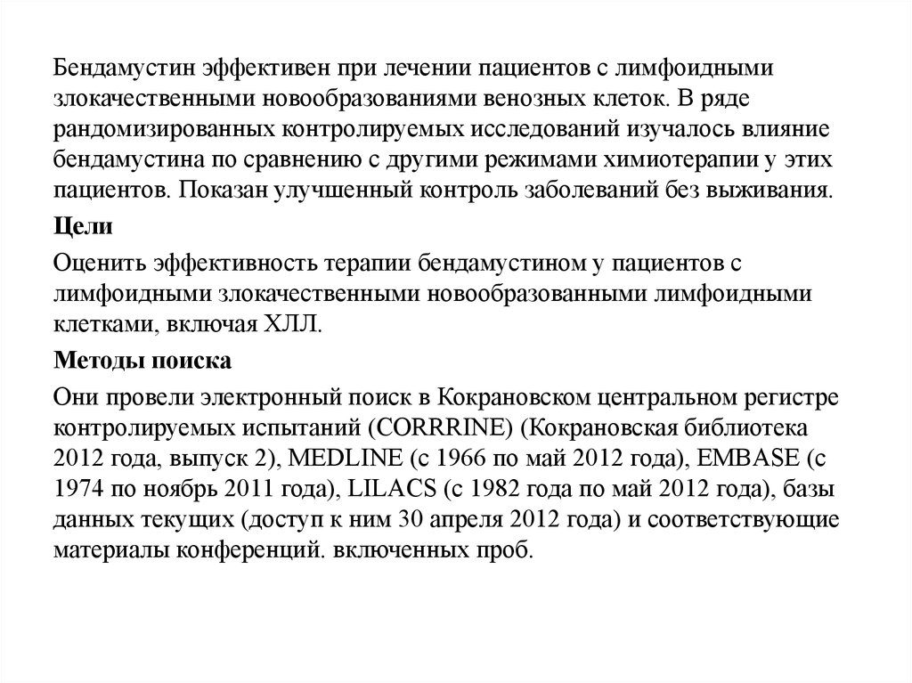 исследования включали только пациентов с ХЛЛ и сравнивали бендамустин с