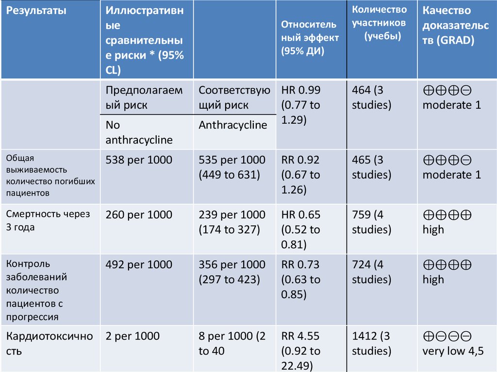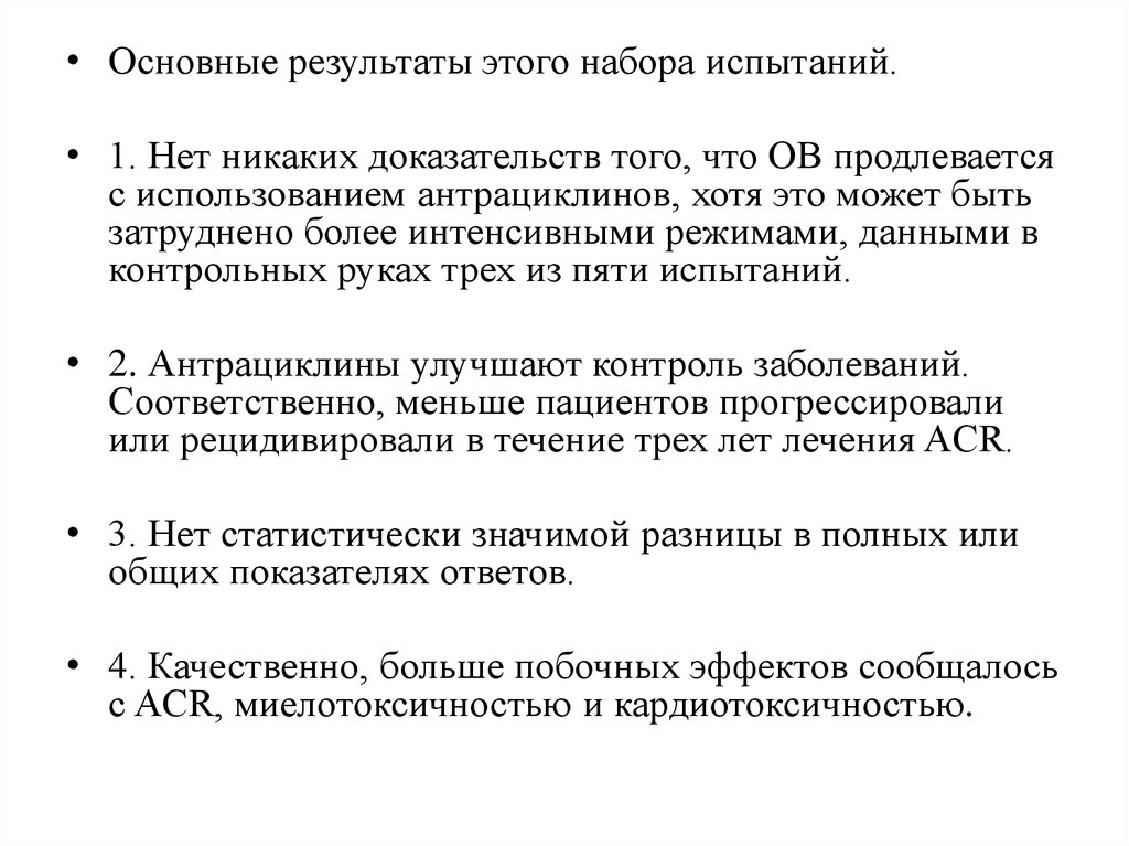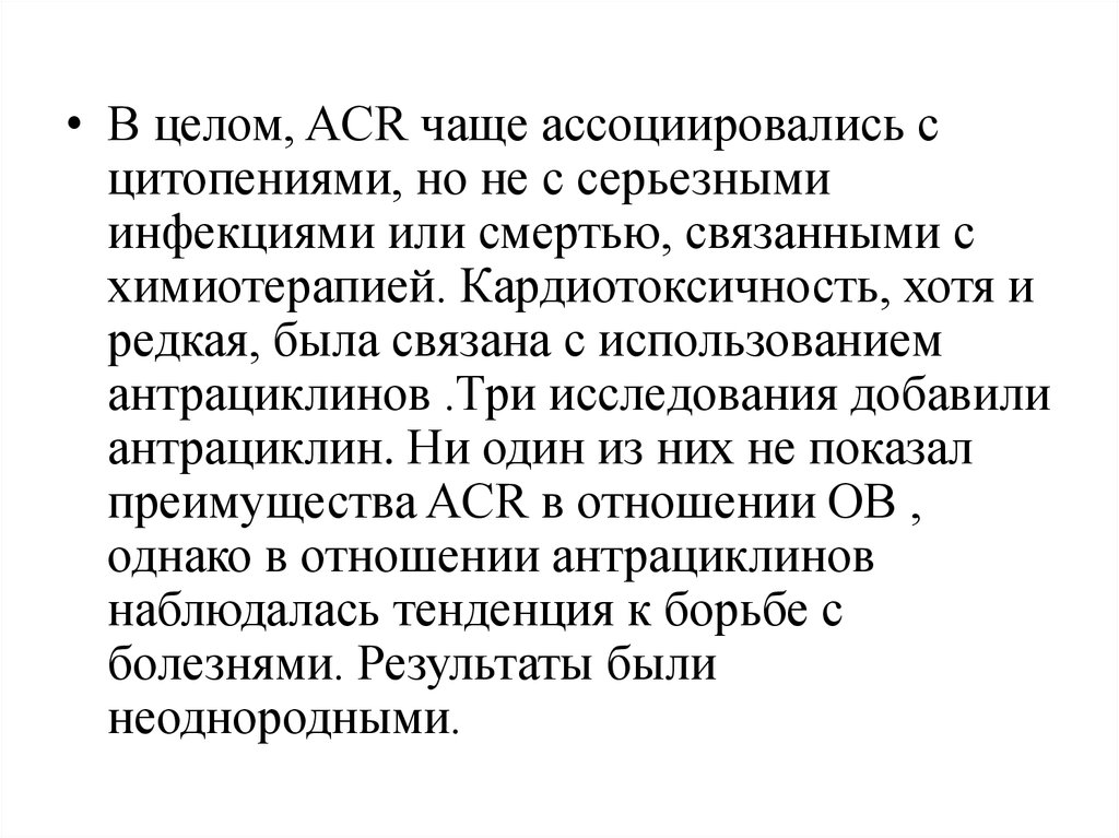 Однако нет доказательств того, что ACR лучше, чем схемы, не содержащие антрациклин (не