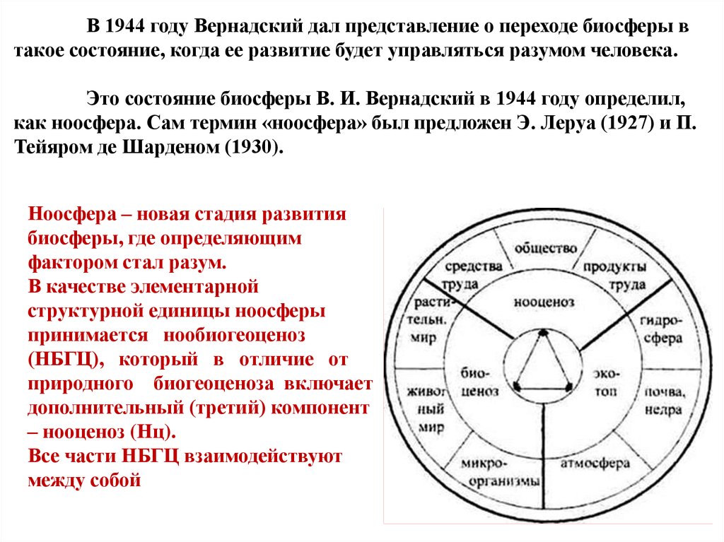 В 1944 году Вернадский дал представление о переходе биосферы втакое состояние, когда ее развитие будет управляться разумом человека.