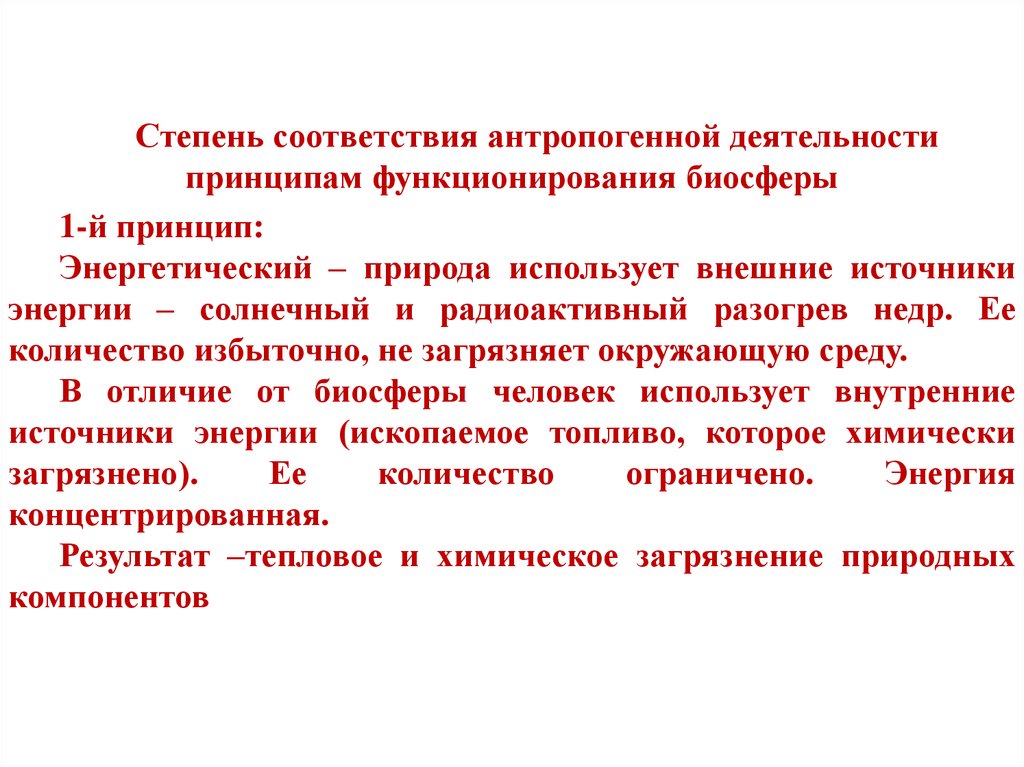 Степень соответствия антропогенной деятельностипринципам функционирования биосферы