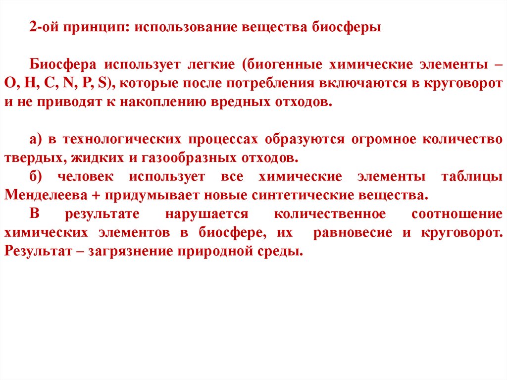 2-ой принцип: использование вещества биосферыБиосфера использует легкие (биогенные химические элементы –