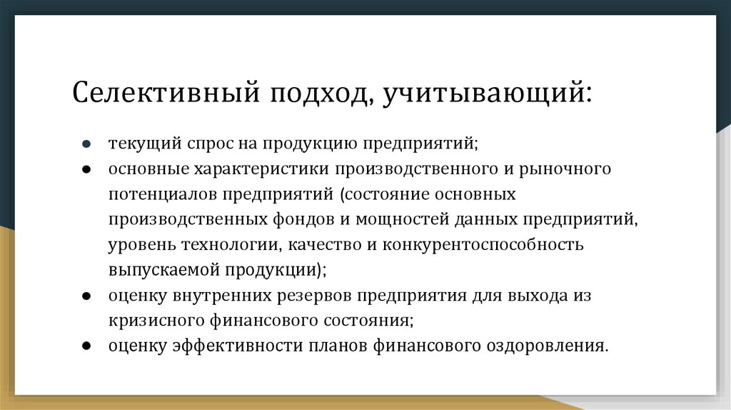 Селективный подход, учитывающий:● текущий спрос на продукцию предприятий;