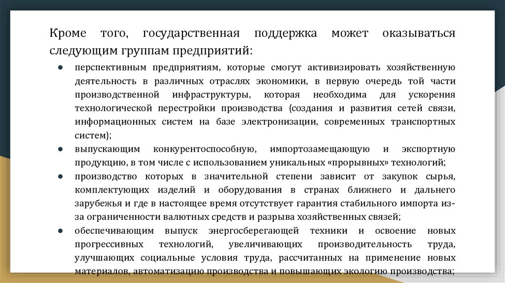 Кроме того, государственная поддержкаследующим группам предприятий: