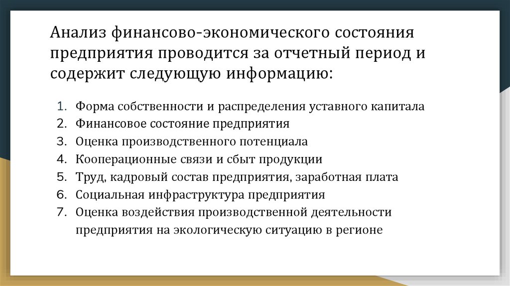 Анализ финансово-экономического состоянияпредприятия проводится за отчетный период и