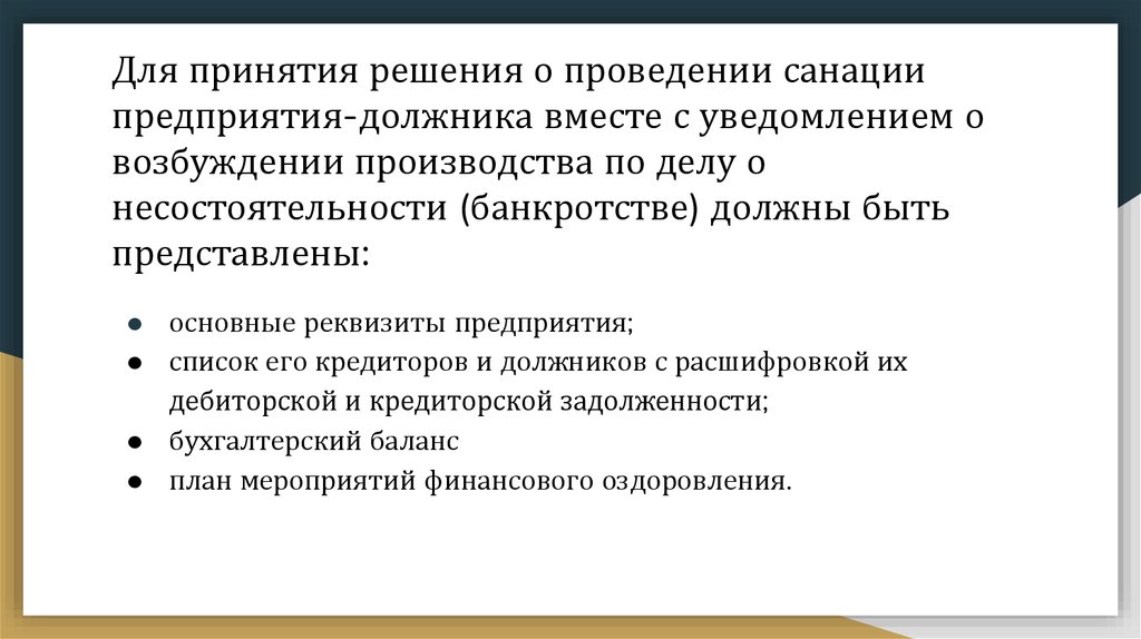 Для принятия решения о проведении санациипредприятия-должника вместе с уведомлением о