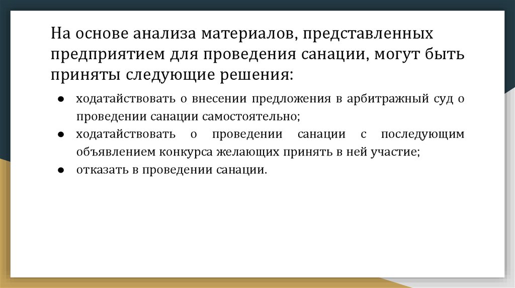 На основе анализа материалов, представленныхпредприятием для проведения санации, могут быть