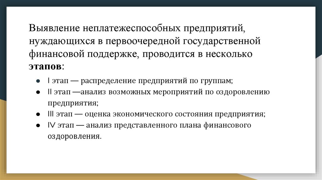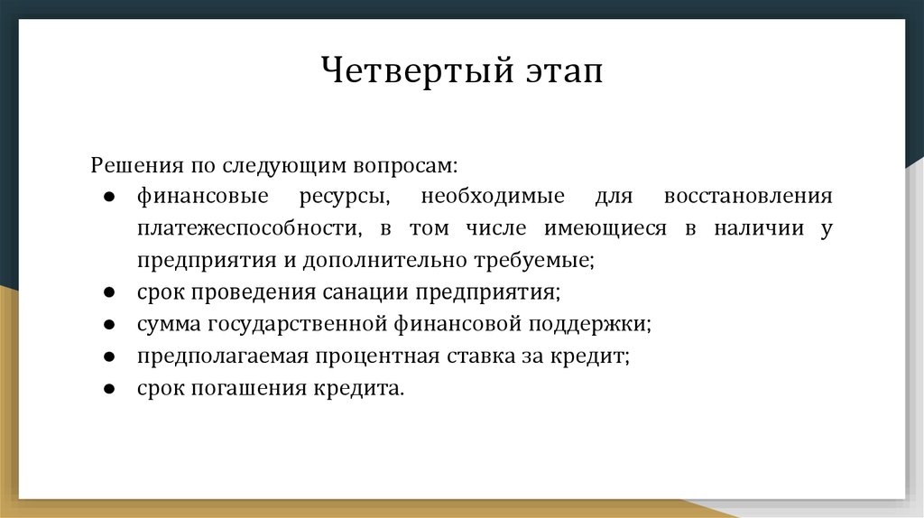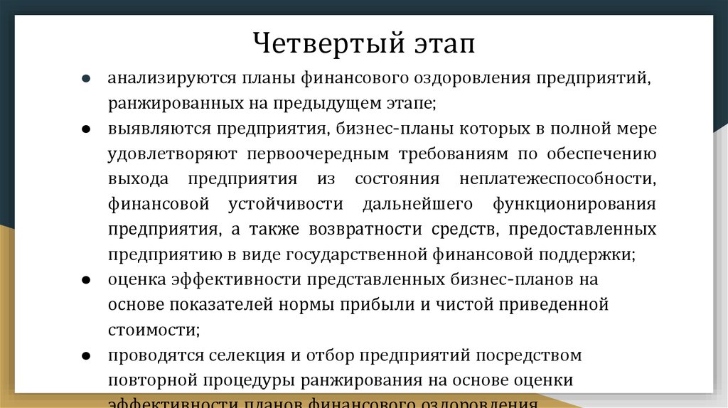 Четвертый этап● анализируются планы финансового оздоровления предприятий,