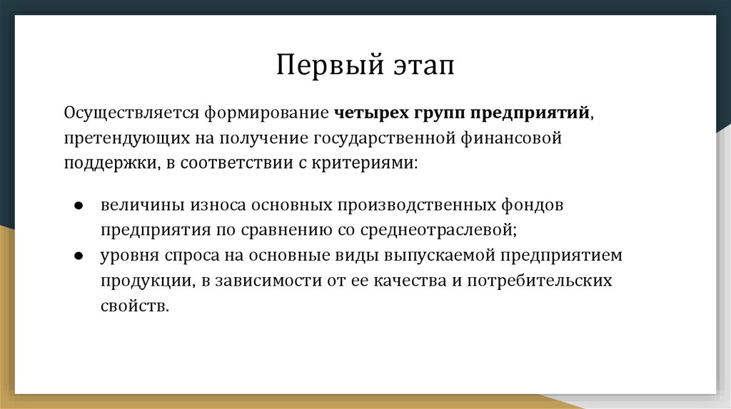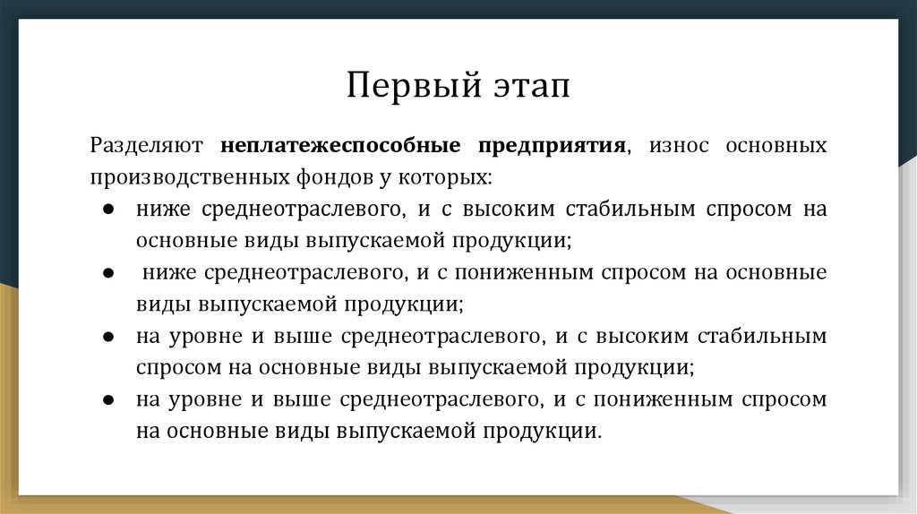 Первый этапРазделяют неплатежеспособные предприятия, износ основных