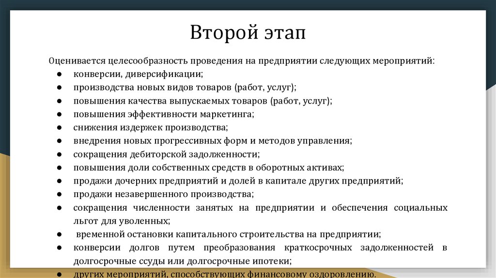 Второй этапОценивается целесообразность проведения на предприятии следующих мероприятий: