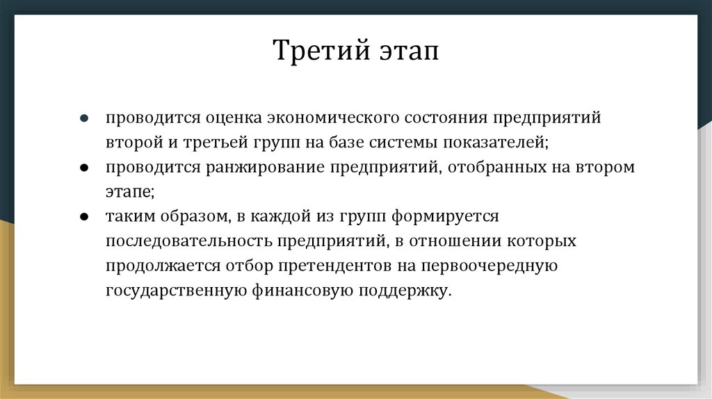 Третий этап● проводится оценка экономического состояния предприятий