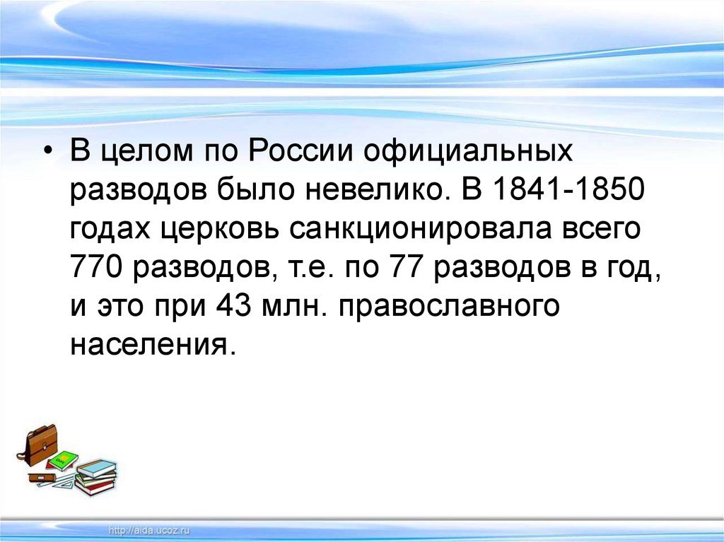 • В целом по России официальныхразводов было невелико. В 1841-1850