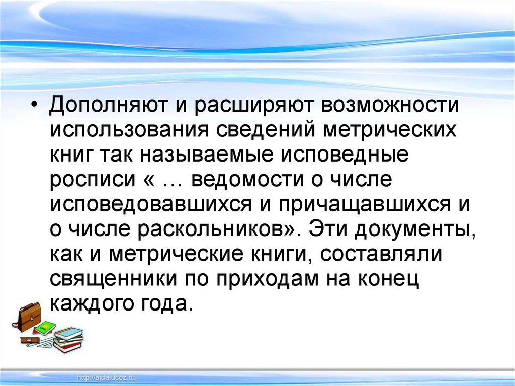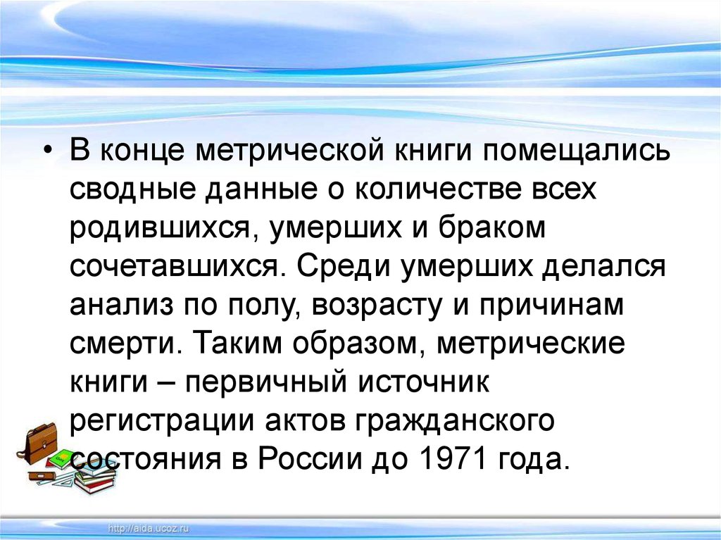 • Дополняют и расширяют возможностииспользования сведений метрических