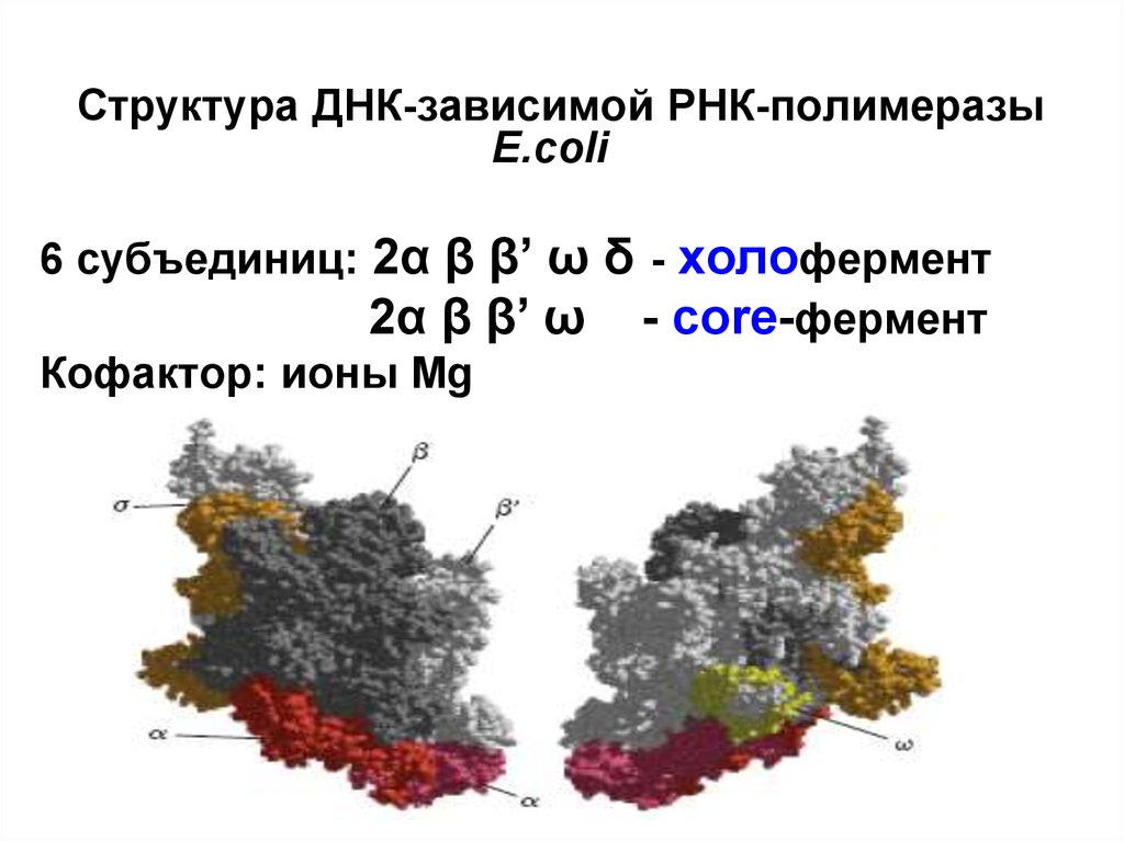 6 субъединиц: 2α β β’ ω δ - холофермент