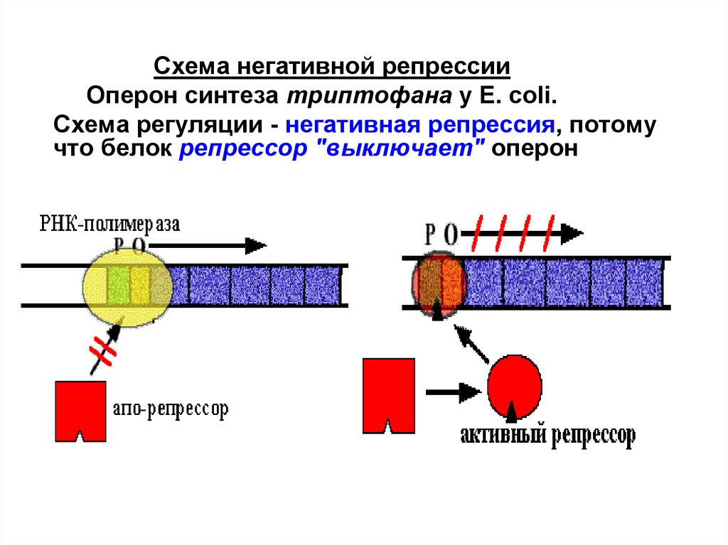 Схема негативной репрессииОперон синтеза триптофана у E. сoli.