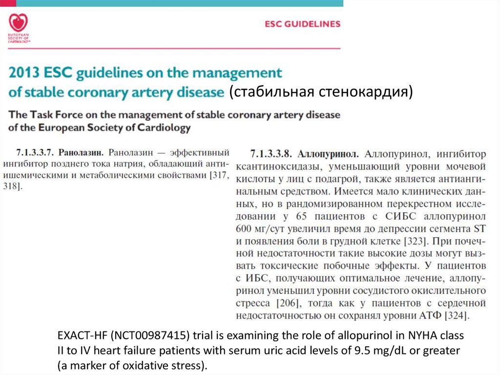 (стабильная стенокардия)EXACT-HF (NCT00987415) trial is examining the role of allopurinol in NYHA class