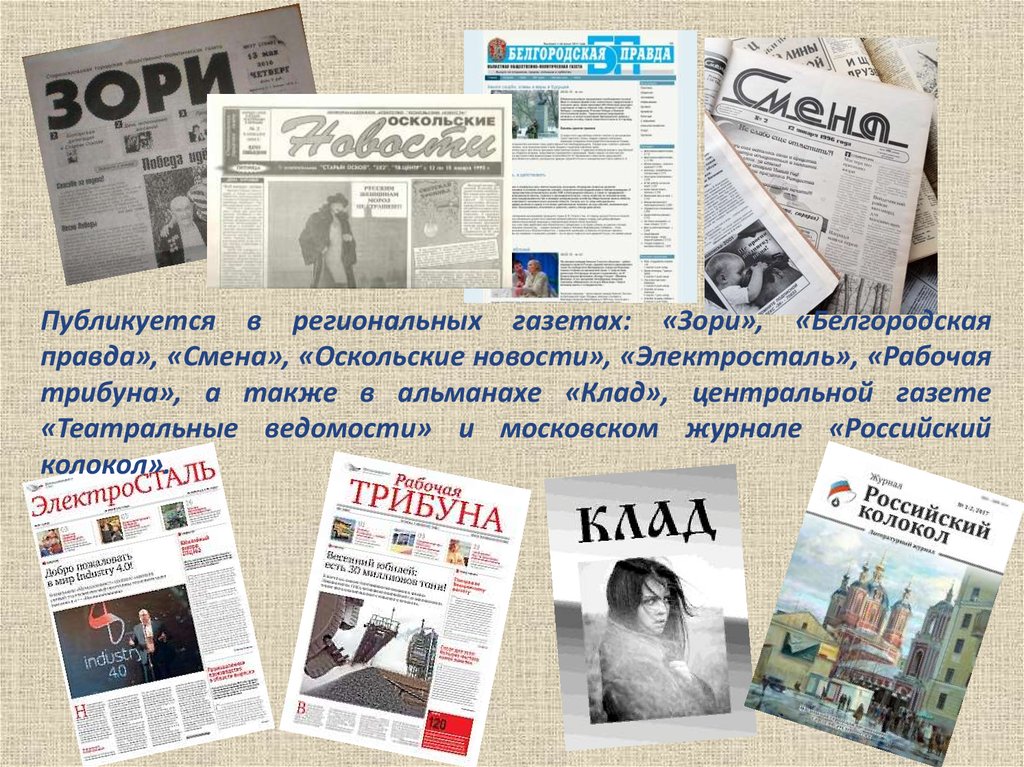 Публикуется в региональных газетах: «Зори», «Белгородскаяправда», «Смена», «Оскольские новости», «Электросталь», «Рабочая