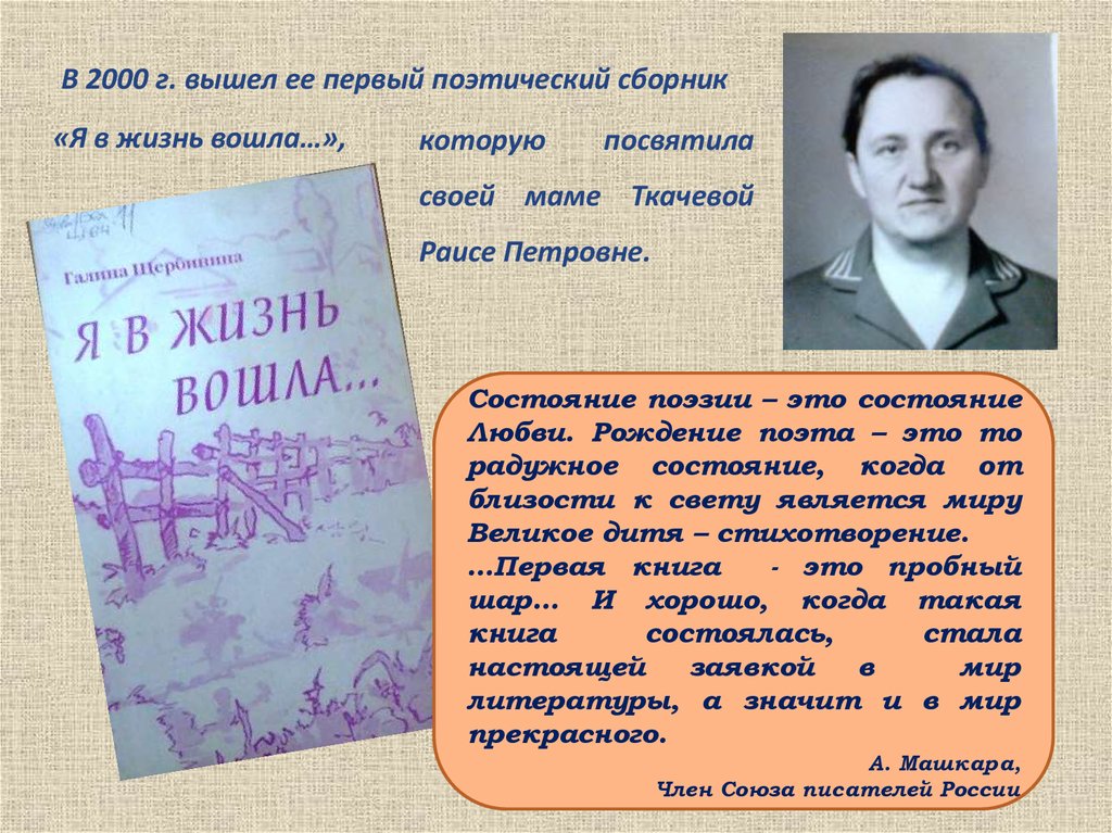 В 2000 г. вышел ее первый поэтический сборник«Я в жизнь вошла…»,