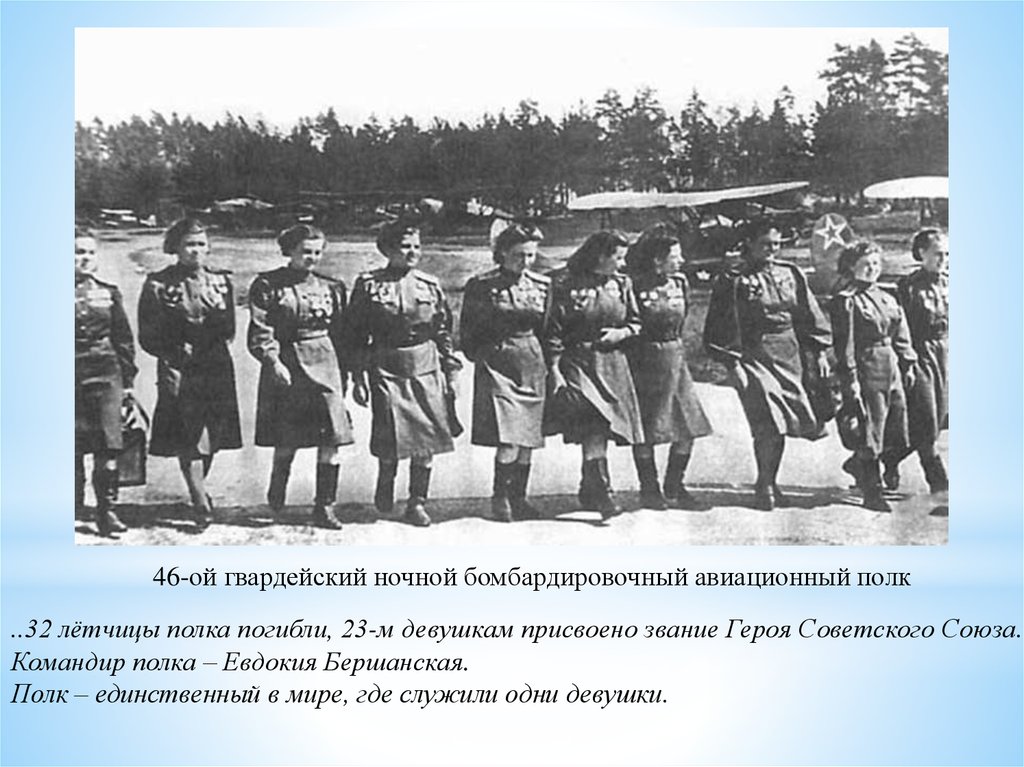 46-ой гвардейский ночной бомбардировочный авиационный полк..32 лётчицы полка погибли, 23-м девушкам присвоено звание Героя Советского Союза.