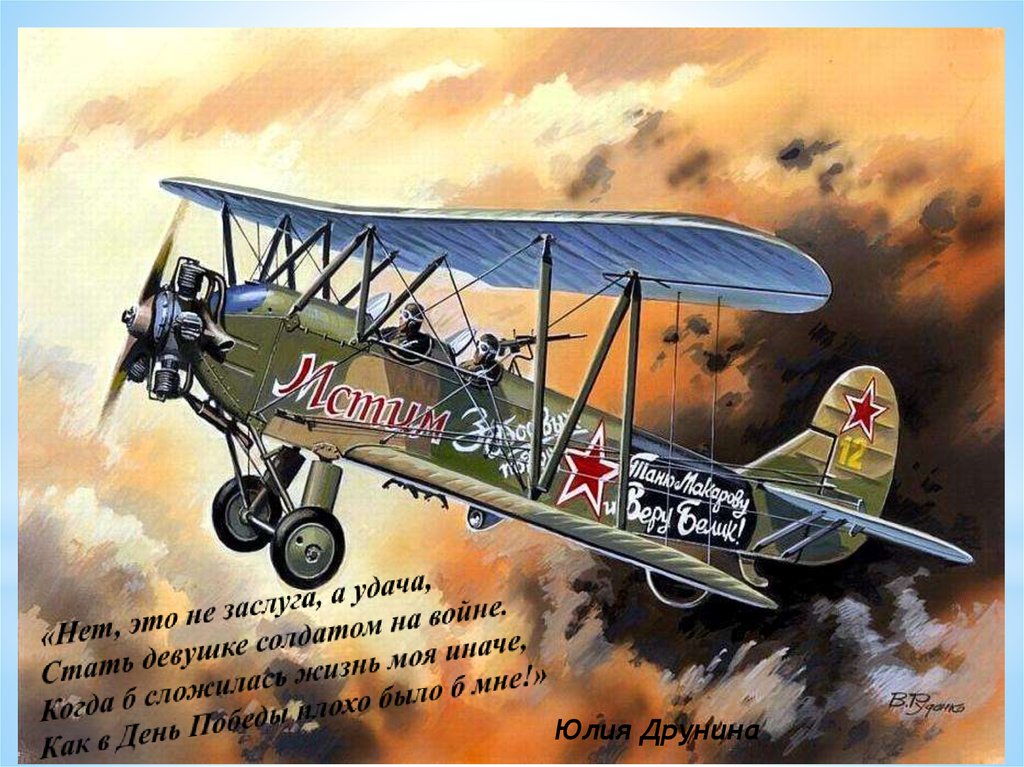 …Лётчицы летали на легких самолётах У-2 – «Небесных тихоходах».Самолёт деревянной конструкции, с открытыми кабинами, без радиосвязи,