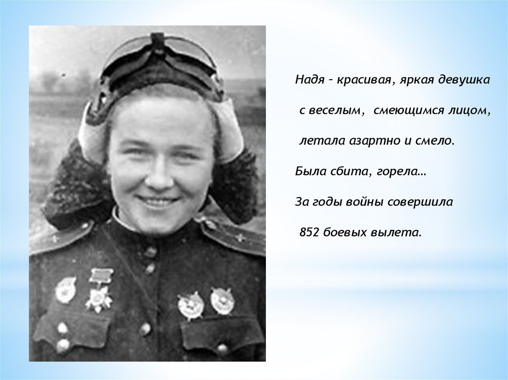 …Училась Надя Попова в школе №132 города Сталино. В 1937 году, перейдя в 10-й класс,она стала посещать аэроклуб. В 1938-м году в газете «Сталинское племя» вышла