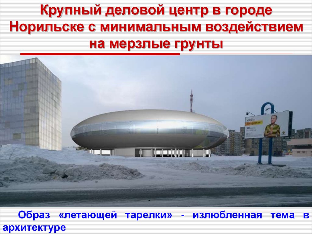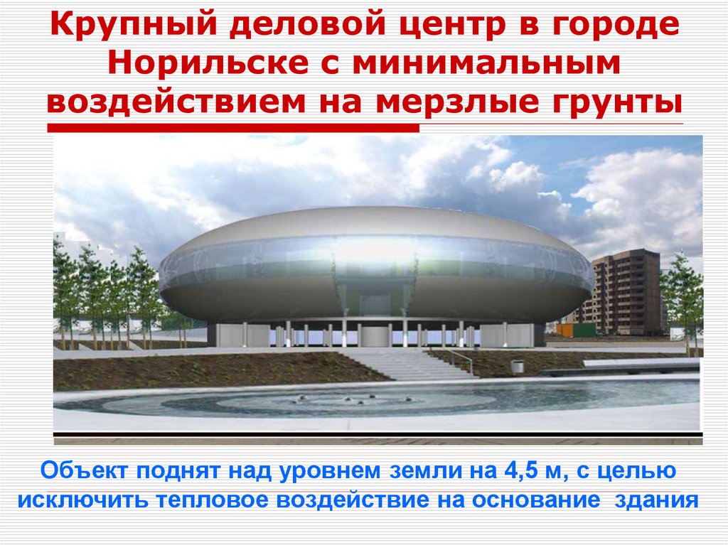 Отсутствие типовых ограждающих конструкций39. Крупный деловой центр в городе Норильске с минимальным воздействием на мерзлые грунты