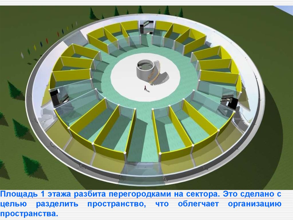 Площадь 1 этажа разбита перегородками на сектора. Это сделано сцелью разделить пространство, что облегчает организацию