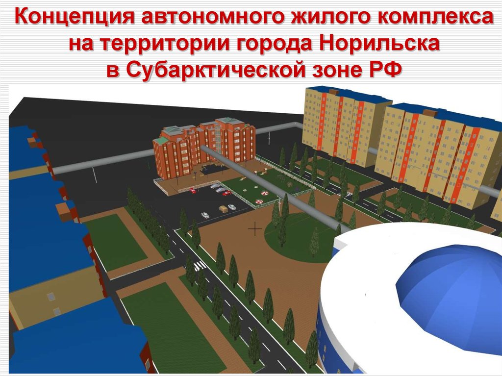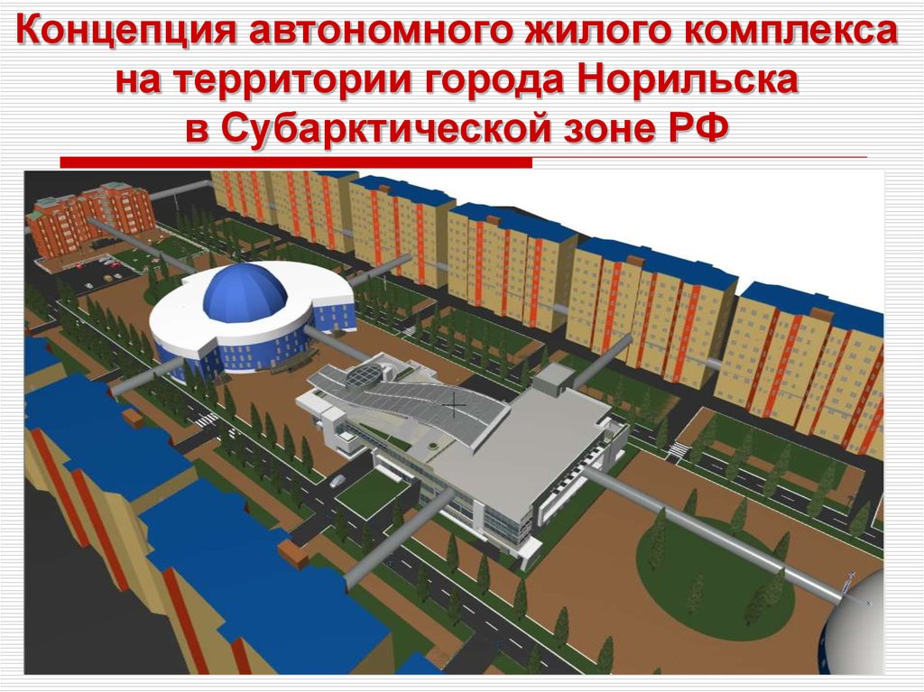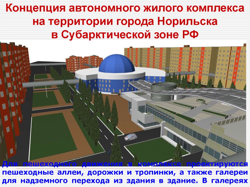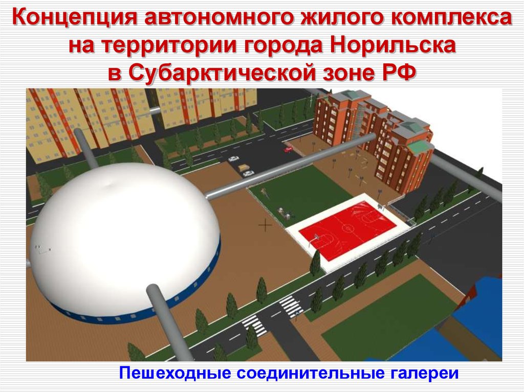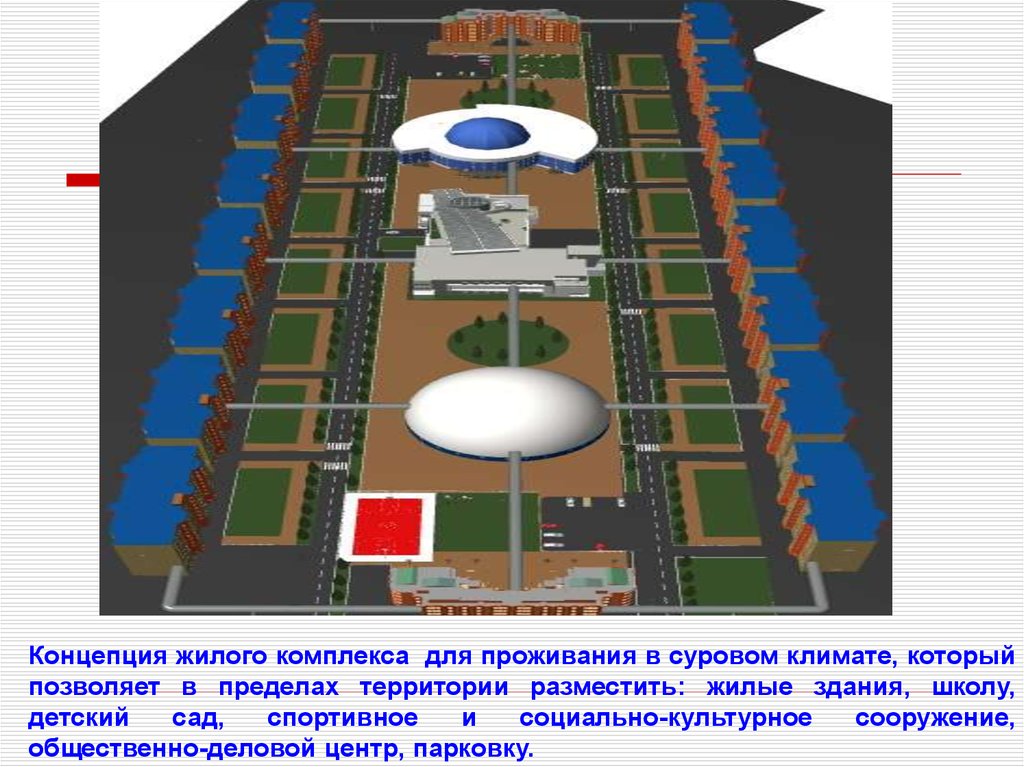 Концепция жилого комплекса для проживания в суровом климате, которыйпозволяет в пределах территории разместить: жилые здания, школу,